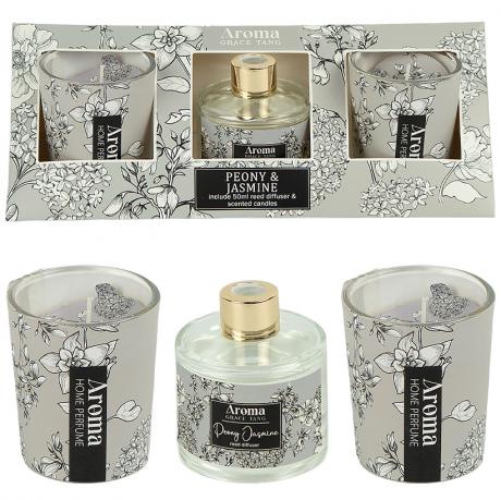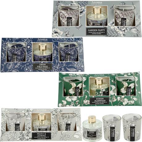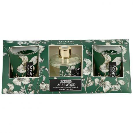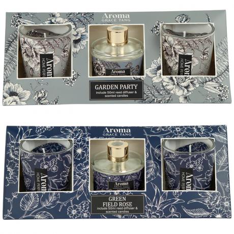 Ароматичний набір містить дві свічки по 125 г розміром 6×4 см та аромадифузор 50 мл у флаконі 6×5 см із 6 паличками у комплекті. Набір упакований в оригінальну коробку розміром 21,5×6,5×6,5 см у формі піраміди. Серія представлена квітковими та зеленими ароматами зі свіжим і легким звучанням. Дифузор підтримує аромат у приміщенні, а свічки створюють затишну атмосферу. Чудовий варіант для подарунка та декору. Товар вигідний для оптових магазинів і підходить для роздрібного продажу.