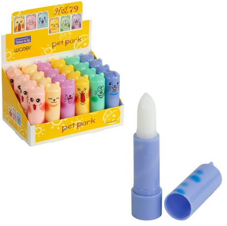 Бальзам для губ 2,5 г — яскравий і зручний аксесуар для щоденного догляду. Формула пом’якшує та зволожує губи, захищаючи їх від сухості. Корпус у вигляді милих звірят робить бальзам привабливим для дітей і дорослих, а компактний розмір дозволяє легко брати його з собою. Висота бальзаму — 6,5 см, діаметр — 2 см. Упаковка-дисплей на 24 шт, розмір — 11,5×6,5×7,5 см. Вдалий варіант для роздрібних і оптових продажів.