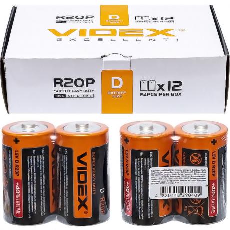Вид батарейки - сольова, модель - Videx R20P/D. Продукт поставляється в упаковці shrink, яка містить 2 батарейки. В одній коробці розміщено 24 таких упаковки, що становить загалом 288 батарейок. Ці батарейки можуть використовуватися в електронних іграшках з дистанційним управлінням, автомобілях на батарейках, ліхтариках. Ціна вказана за одну батарейку.