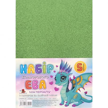 Світло-зелений фоаміран з гліттером, розміром А4 (21х29,7см), товщиною 1.6 мм, в наборі 5 листів. Має клейову основу. Цей матеріал використовується в різних видах рукоділля, включаючи створення флористичного декору, біжутерії, весільних композицій, елементів подарункових упаковок, вітальних листівок та дитячих аплікацій. Модель GL-EVA-1-ADH-011.