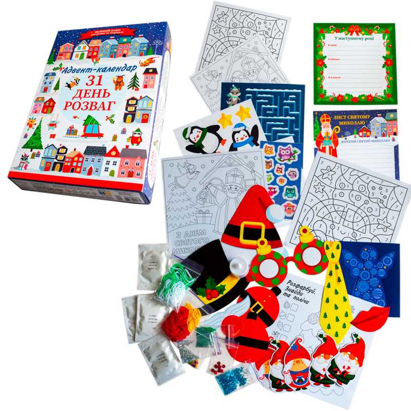 гр Адвент-календар "2025" 10100745У (12) "Ранок", заготовки ялинкових іграшок, розмальовки, цікаві завдання, мозаїка, трафарет для малювання на склі, листівки, магнітна стрічка, намистини, бісер, в коробці