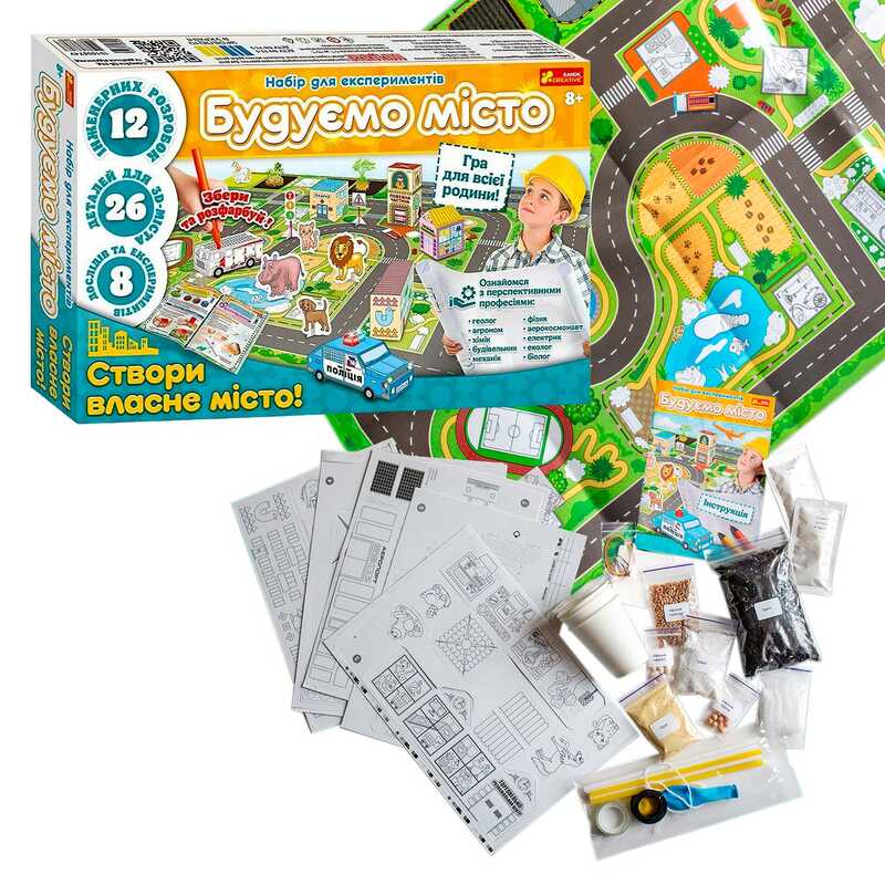 - гр Набір для експериментів "Будуємо місто" 10100674У (6) "Ранок", 12 інженерних проєктів, 8 наукових експериментів, 26 деталей, в коробці
