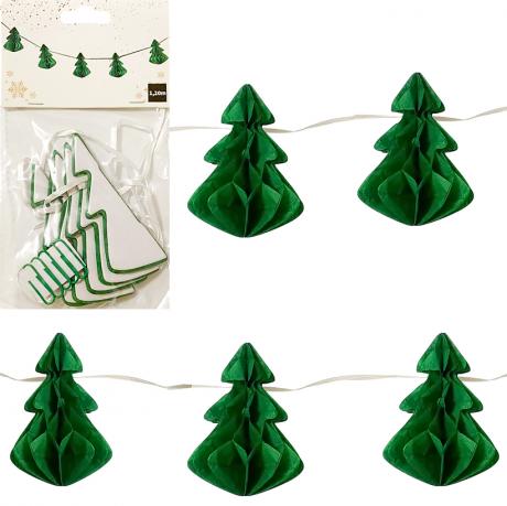 Гірлянда декоративна довжиною 1,2 м складається з об’ємних фігур у формі ялинок діаметром 8 см. Елементи виготовлені з щільного картону із зеленою окантовкою та з’єднані білою стрічкою. Легка та святкова гірлянда ідеально підходить для прикрашання інтер’єру, вітрини чи фотозони.Пакування:11*20см.