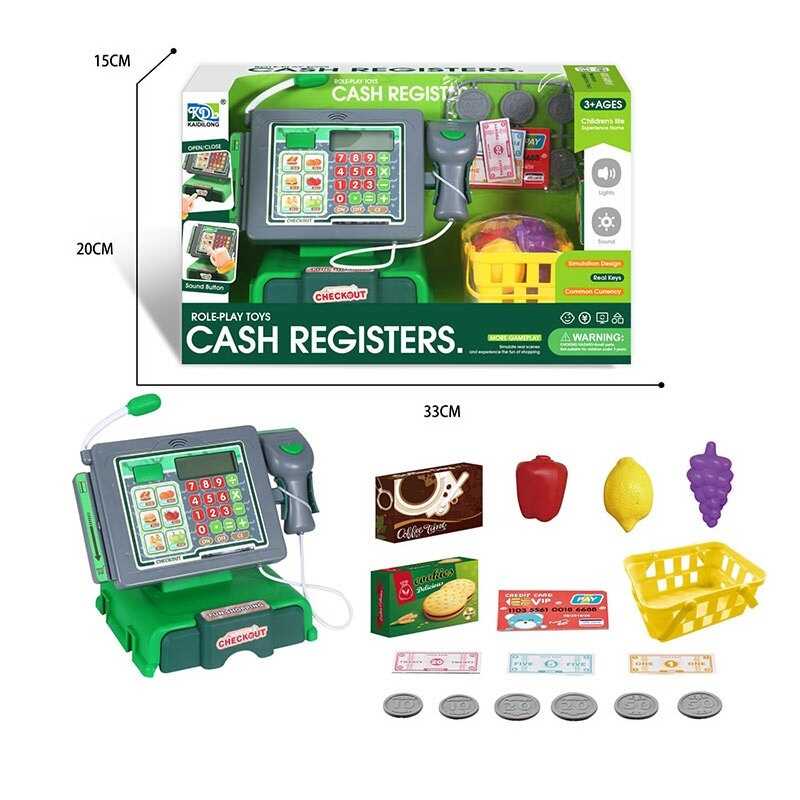 - Касовий апарат KDL 888-57 (36/2) розмір: 21х14х17 см, сканер, калькулятор, мікрофон, звук, підсвічування, висувний ящик, продуктовий кошик, овочі, гроші, банківська картка, в коробці
