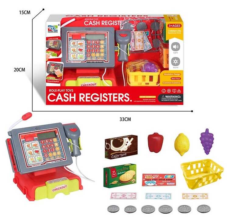 - Касовий апарат KDL 888-58 (36/2) розмір: 21х14х17 см, сканер, калькулятор, мікрофон, звук, підсвічування, висувний ящик, продуктовий кошик, овочі, гроші, банківська картка, в коробці
