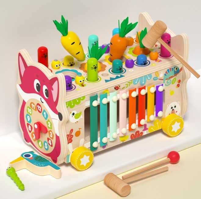 - Каталка C 75299 (24) дерев'яна, ксилофон, грядка з морквинами, рухомі шестерінки, гра з “вибиванням” фігурок, годинник з рухомими стрілками, магнітні черв’ячки і пташка, дзеркало, в коробці