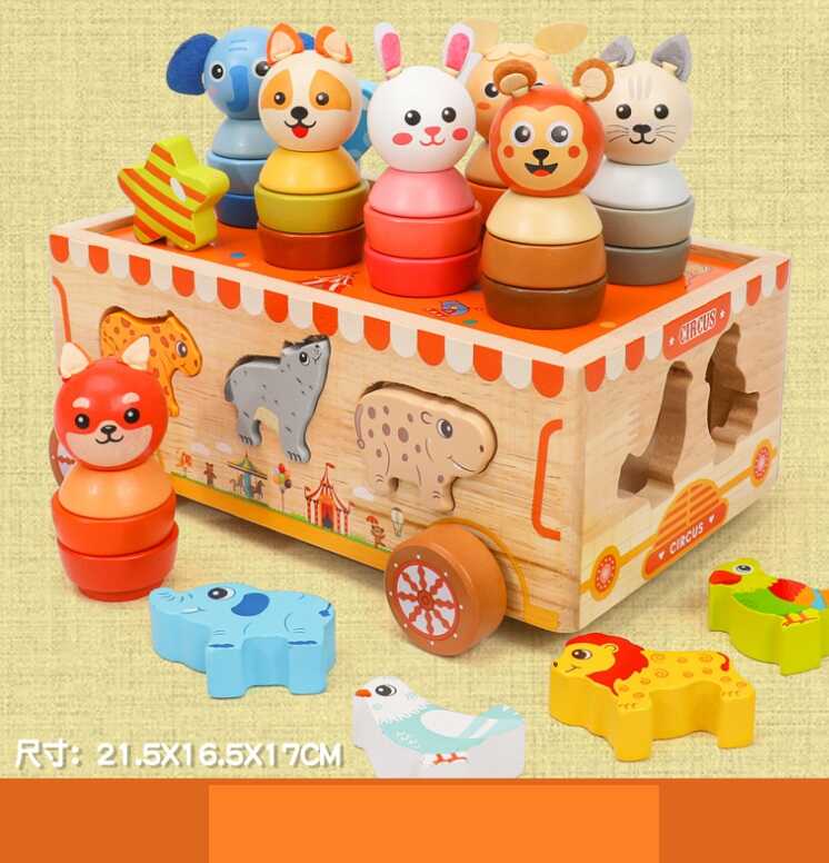 - Каталка C 75300 (24) дерев’яна, сортер із фігурками тваринок, кілочки з кільцями та голови тваринок, в коробці