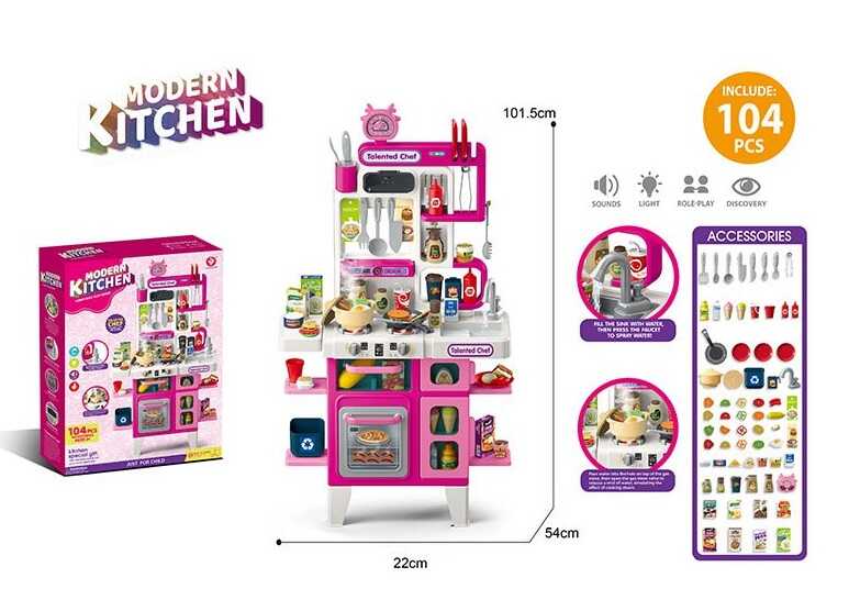 - Кухня 922-211 (8) висота 102 см, 104 елементи, світло, звук, парогенератор, помпова подача води, кухонні й столові прибори, каструля, смітник, продукти, в коробці