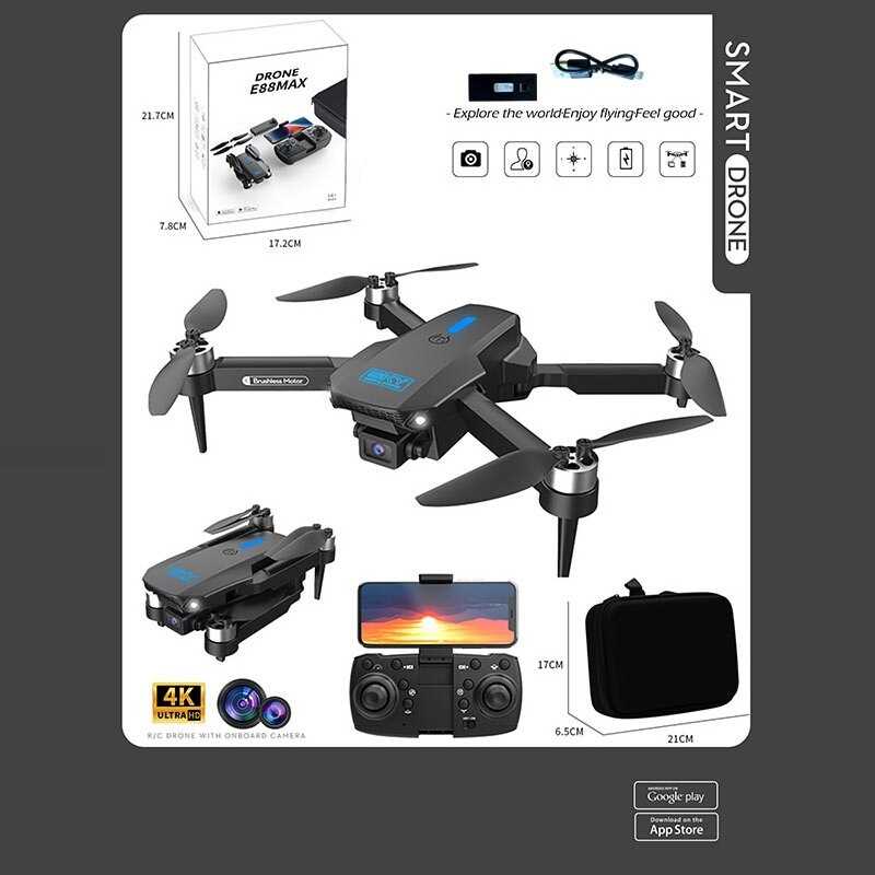 - Квадрокоптер на радіокеруванні E 88 MAX (36) акумулятор, USB-кабель, викрутка, пульт, підсвічування, HD камера, сумка для зберігання, додаток, в коробці