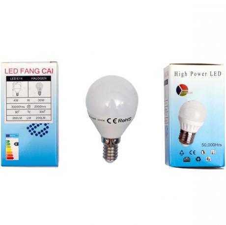 Світлодіодна лампа з цоколем E14 потужністю 4W. Напруга 220-240V, частота 50-60 Гц. Світловий потік становить 350 Lm з колірною температурою 3000 K, що забезпечує тепле біле світло. Кут розсіювання 80°, матовий розсіювач. Термін служби до 50 000 годин. Розмір лампи 78х45 мм.