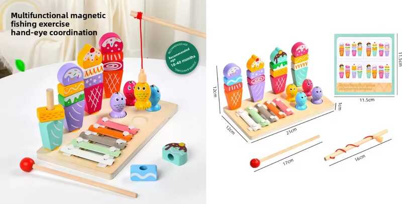 - Логічна дерев’яна дошка C 75286 (48) 21х12 см, 3 гри: магнітна риболовля, гра з кілочками та ксилофон, дерев’яна вудочка, молоточок, в коробці