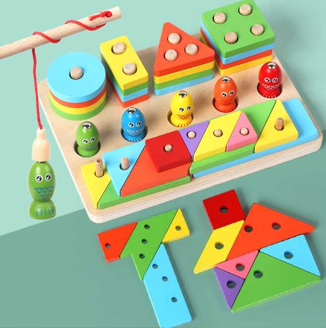 - Логічна дерев'яна дошка C 75298 (30) геометричний сортер, танграм, сортер за кольорами, магнітна риболовля, 5 рибок, вудка, в коробці