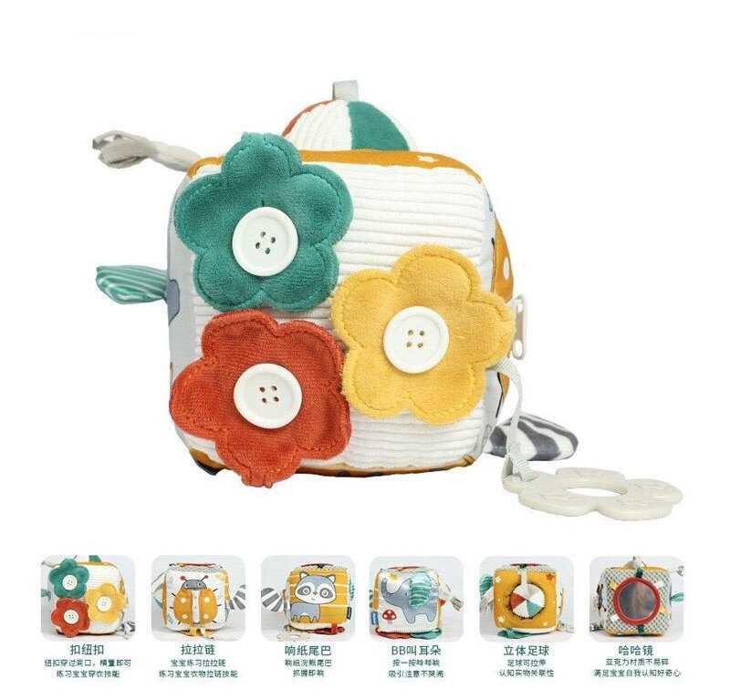 - Логічний куб 9393 A (45) брязкальце, прорізувач, дзеркальце, пискавка, шурхотить, пальчикова гра з ґудзиками, в пакеті