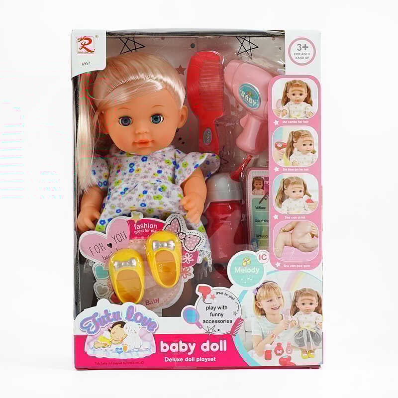 - Лялька 6952 (24) п’є з пляшечки, ходить у горщик, закриває очі, музичний чіп, висота 28 см, в коробці