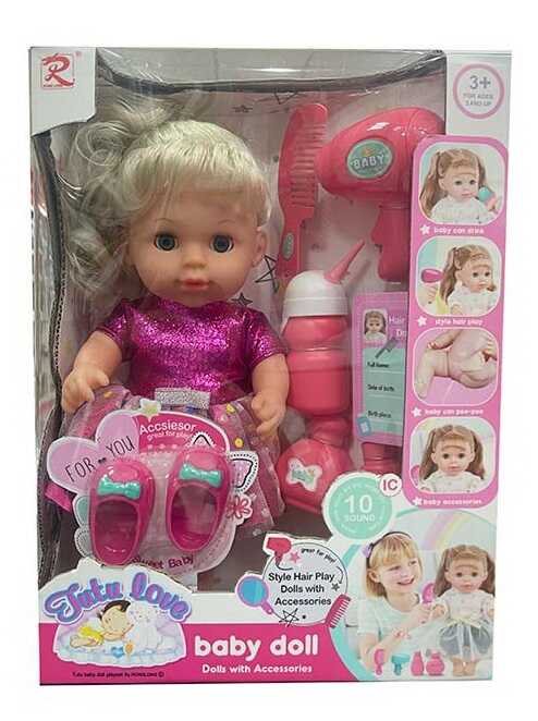 - Лялька 6958 (24) п’є з пляшечки, ходить у горщик, закриває очі, музичний чип, висота 28 см, в коробці