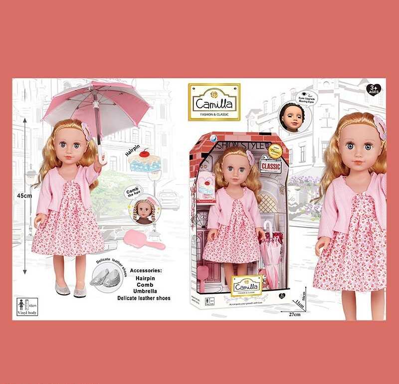 - Лялька A 931 B (24/2) висота: 45 см, імітація скляних очей, закриває очі, прошите волосся, гребінець, аксесуари, в коробці