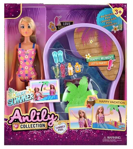 Лялька з аксесуарами 616112 (18) висота 29 см, знімний одяг та взуття, об’ємний басейн, гірка, пальма, склянки для напоїв, крем від сонця, капці, в коробці