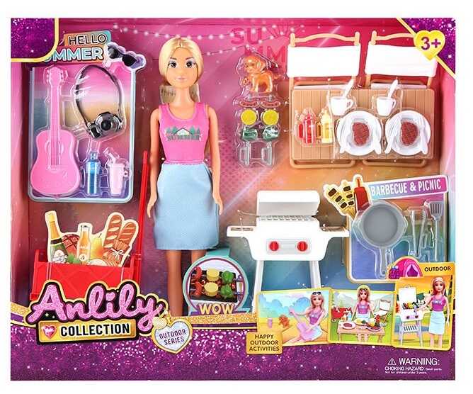 Лялька з аксесуарами 616256 (18) висота 30 см, знімний одяг та взуття, гриль, стіл та стільці, продукти, столовий та кухонний посуд, гітара, фотоапарат, улюбленець, візок, в коробці