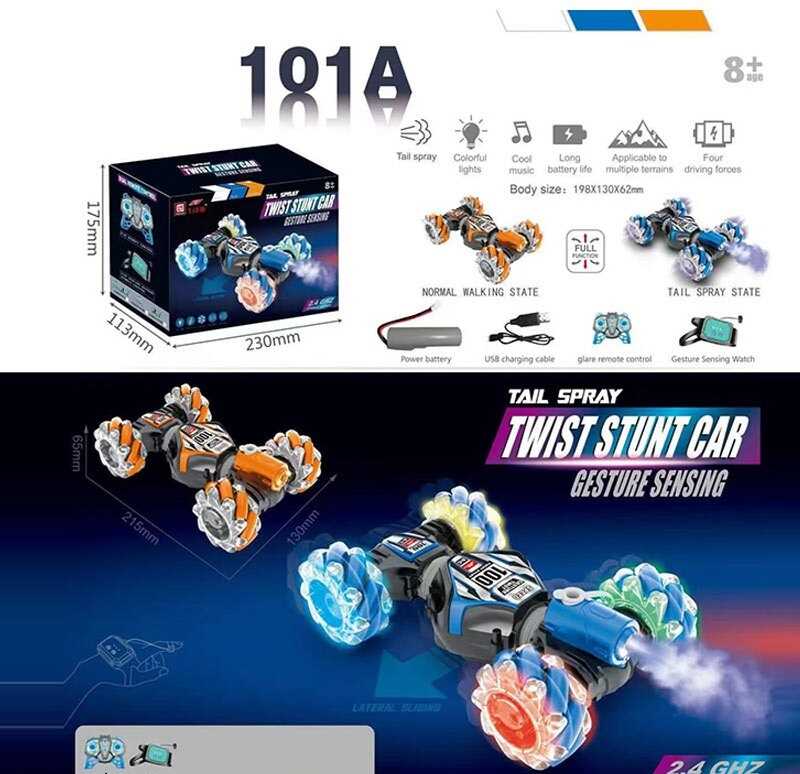 - Машина на радіокеруванні CV 8818-101 A (36) 2 види, акумулятор: 3.7 V, пульт: 2.4 GHz, браслет: 2.4 GHz, 4WD, оберт: 360°, зміна положення корпусу, парогенерація, підсвічування, звуки, музика, роликові колеса, USB-кабель, в коробці