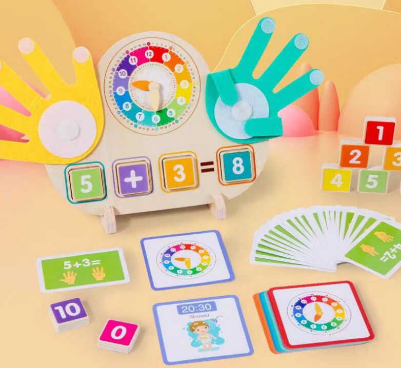 - Математична дошка C 75292 (40) двосторонні кубики з цифрами, годинник із рухомими стрілками, картки із прикладами та розпорядком дня англійською, долоні з липучками, в коробці