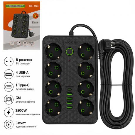 - Мережевий фільтр подовжувач 3м на 8 розеток з 4 USB + 1 Type-C та вимикачем AD26-22