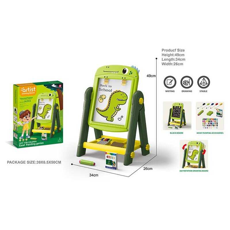 - Мольберт 050-65 (18) двосторонній, з полицею, розмір: 34х26х49 см, оберт: 360°, 5 кольорових маркерів “пиши-витирай”, крейда у 12ти кольорах, магнітна англійська абетка, цифри, лінійка, тримачі, в коробці