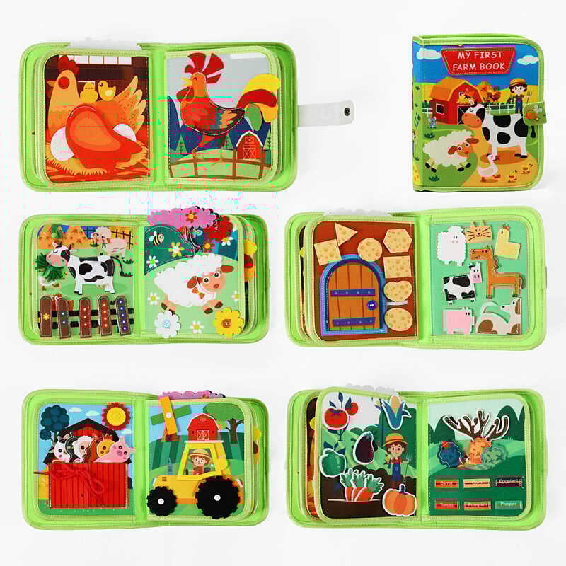 - М'яка книжка-бізіборд C 73097 (32) “Ферма”, фетр, елементи на липучках, пискавка, пальчикові ігри, вивчення тварин, овочів, форм, в пакеті