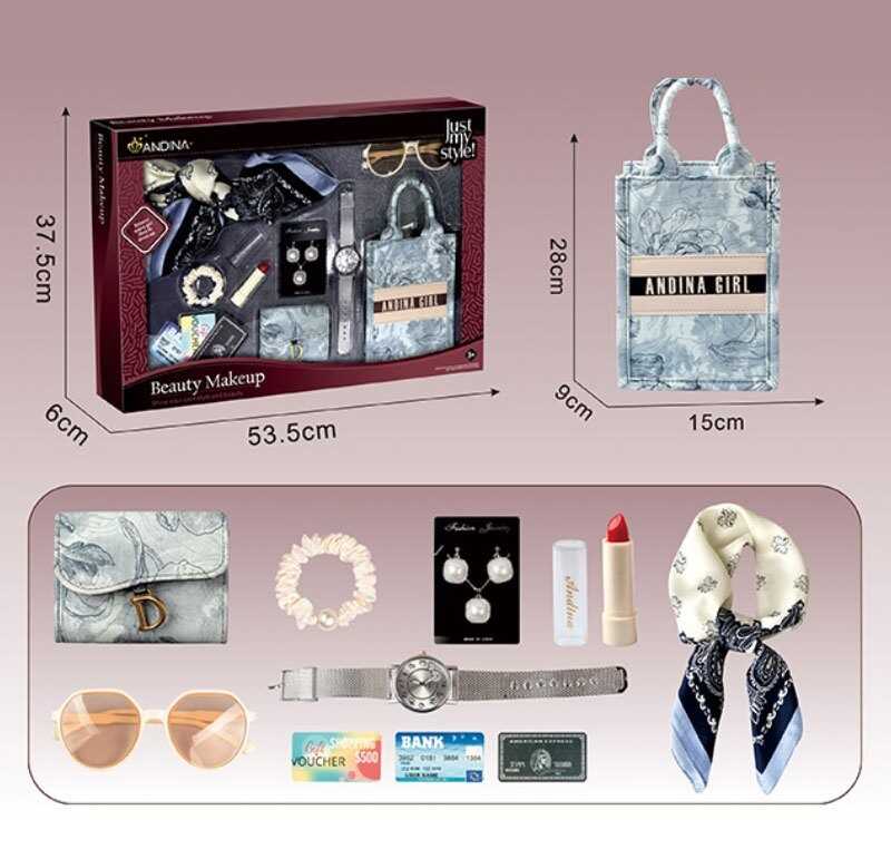 - Набір аксесуарів 676-4 (24) функціональний годинник, сумочка, хустка, окуляри, гаманець, прикраси, імітація косметики, резинка, в коробці