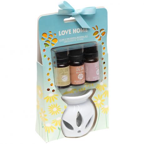 Набір ароматичних олій містить 3 флакони по 10 мл з однаковим ароматом та білу керамічну лампу зі свічкою-таблеткою у комплекті. Висота лампи — 7,5 см, діаметр верхньої чаші — 6,5 см, діаметр основи — 5 см. Постачається у картонній упаковці розміром 20,5×11х4 см. Кераміка рівномірно прогрівається та м’яко розкриває аромат.