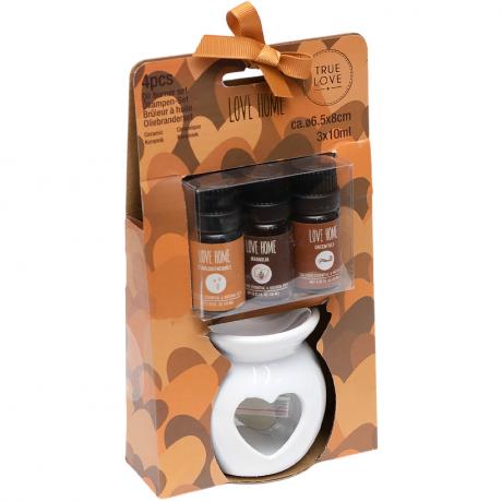 Набір ароматичних олій містить 3 флакони по 10 мл з однаковим ароматом та керамічну лампу молочного кольору зі свічкою-таблеткою у комплекті. Висота лампи — 7,5 см, діаметр верхньої чаші — 6,5 см, діаметр основи — 5,5 см. Постачається у картонній упаковці розміром 21×11,5х4 см. Кераміка рівномірно прогрівається та м’яко розкриває аромат. Серія представлена квітковими та свіжими композиціями з делікатним звучанням. Підходить для дому, спальні та зони відпочинку, а також для подарункового асортименту. Товар вигідний для оптових магазинів і підходить для роздрібного продажу.