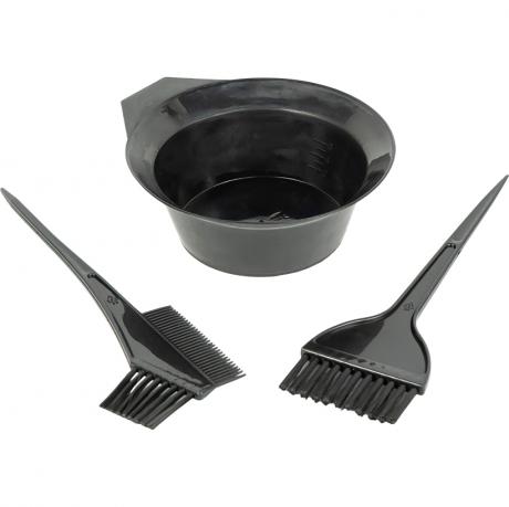 Набір для фарбування волосся призначений для зручного змішування та нанесення фарбувальних складів. У комплект входять миска та дві щітки: одна стандартна для нанесення фарби і одна щітка з гребінцем з іншого боку для розподілення складу по волоссю. Розмір миски — 5×8,5×13 см, максимальний об’єм до краю — 300 мл, всередині нанесена мірна шкала в мл. Розмір щітки — 20×6 см, розмір щітки-гребінця — 20×6,5 см. Набір підходить для використання вдома та у перукарнях. Постачається у пакеті. Ціна вказана за 1 набір. Товар вигідний для оптових магазинів і підходить для роздрібного продажу.
