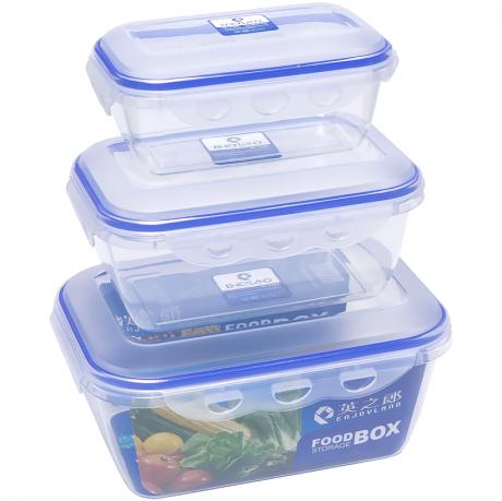 Набір герметичних контейнерів для зберігання продуктів складається з трьох одиниць. Об'єм контейнерів: 3.1 л, 1.6 л, 0.8 л. Виготовлені з пластику, кришки мають прогумовану вставку для запобігання витіканню. Підходять для температурного режиму від -20 °C до 100 °C.