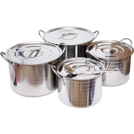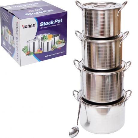 Місткий набір каструль з нержавіючої сталі підходить для приготування великих об’ємів їжі. До комплекту входять 4 каструлі об’ємом 8000 мл, 7000 мл, 5000 мл та 4000 мл. Діаметр становить 30 см, 28 см, 26 см і 24 см відповідно. Каструлі виготовлені з нержавіючої сталі з матовою шліфованою поверхнею. Кожна каструля комплектується металевою кришкою з нержавіючої сталі. У наборі також є металева роздаткова ложка. Набір упакований у коробку розміром 29×29×27 см. Ціна вказана за набір. Товар вигідний для оптових магазинів і підходить для роздрібного продажу.