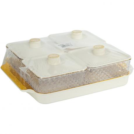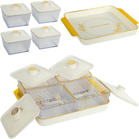 Набір контейнерів для зберігання — практичне рішення для кухні, вітальні або сервірування столу. У комплект входить міцний піднос і чотири прозорі баночки з кришками, виконані у стильному дизайні із золотистим акцентом. Контейнери підходять для зберігання солодощів, горіхів, сухофруктів, спецій або дрібних аксесуарів. Щільні кришки захищають вміст від пилу, а компактна форма заощаджує місце. Розмір баночки: 10×10×5,5 см, підноса: 24×20×2,5 см.