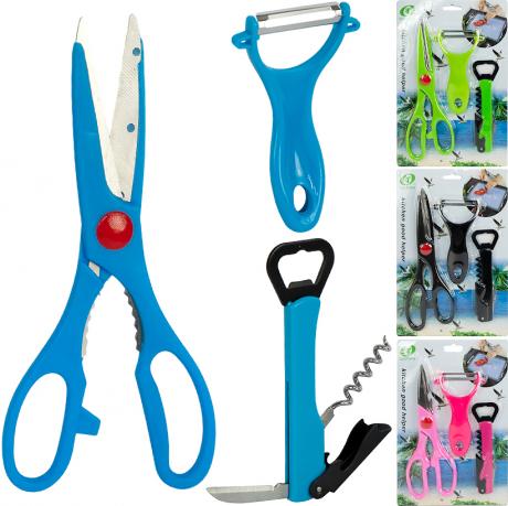 Набір кухонного приладдя 3 в 1 — містить ножиці, овочечистку та відкривачку. Універсальний комплект стане у пригоді під час щоденного приготування: ножиці зручні для зелені, риби та птиці, овочечистка легко знімає шкірку, а відкривачка корисна для пляшок і банок. Ергономічні ручки забезпечують комфорт і безпеку у використанні. Компактний набір стане незамінним помічником на кухні.