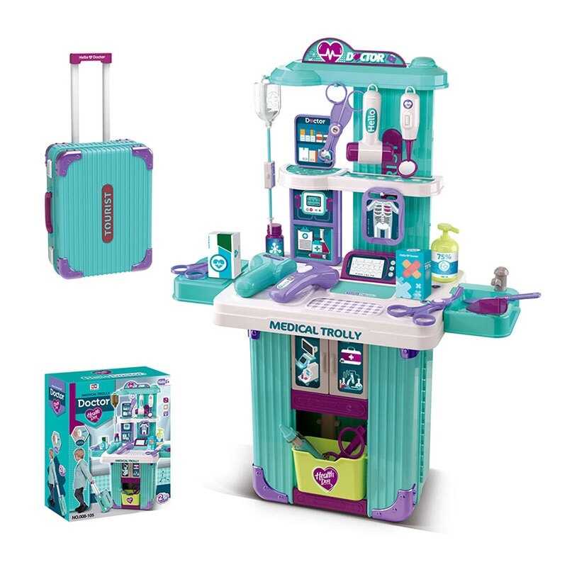 - Набір лікаря 008-105 (8) валіза, висувна ручка, на коліщатках, монітор, електронний термометр, сканер, дзеркало, молоточок, окуляри, ножиці, шприц, крапельниця, ліки, кошик, наліпки, в коробці