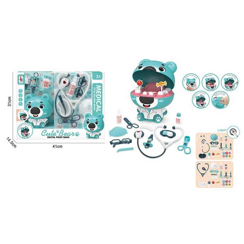 Набір лікаря SD 169-356 A (15) “Стоматолог”, висота ведмедика - 16 см, скарбничка, стетоскоп, підсвічування, шприц, ножиці, щипці, медичний лоток, окуляри, маска, в коробці