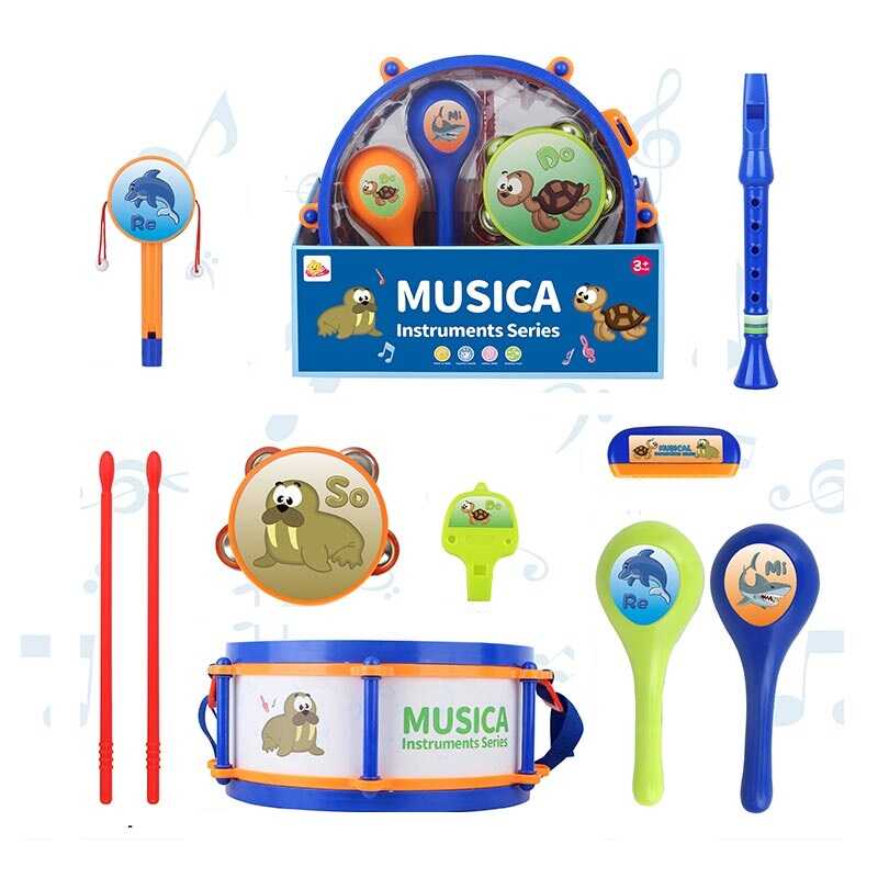 - Набір музичних інструментів 717 A (24) барабан: 28х28х12 см, барабанні палички, маракаси, бубон, колотушка, свисток, сопілочка, дудка, ремінець, в коробці