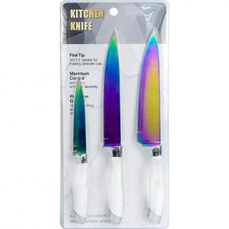 Набір кухонних ножів DK-3000 з 3 предметів призначений для щоденного використання на кухні та зручної обробки різних продуктів. До комплекту входять три ножі загальною довжиною 24 см, 32 см і 32 см, що дозволяє підібрати оптимальний інструмент для різних завдань — від точної нарізки овочів і фруктів до роботи з м’ясом. Розміри лез становлять 12×2,3 см, 19×3 см та 19×4 см, що забезпечує акуратний і контрольований різ при роботі з інгредієнтами різної щільності. Гострі леза з тонким кінчиком поєднані з ергономічними ручками, які зручно лежать у руці та підходять для тривалого використання. Набір упакований у блістер розміром 38×18 см, зручний для зберігання та викладки.