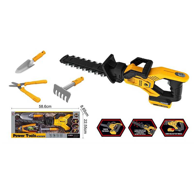 - Набір інструментів T 021 (12) кущоріз на батарейках, звукові ефекти, зубці рухаються, рухома ручка-тримач, садові ножиці, лопатка, граблі, в коробці