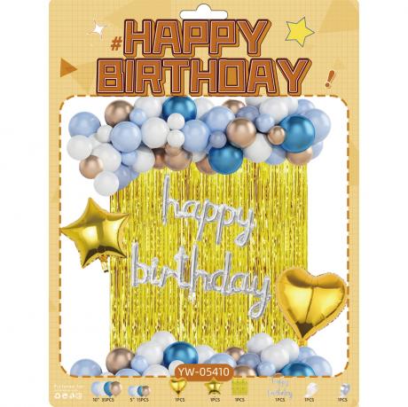 Набір повітряних кульок включає 35 куль діаметром 10 дюймів (блакитний, білий, синій, бронзовий) та 15 куль діаметром 5 дюймів. Додатково є одна фольгована кулька у формі серця, одна у формі зірки, одна кулька з написом, шторка для фотозони з дощу, стрічка для кріплення та рулон клейових точок.