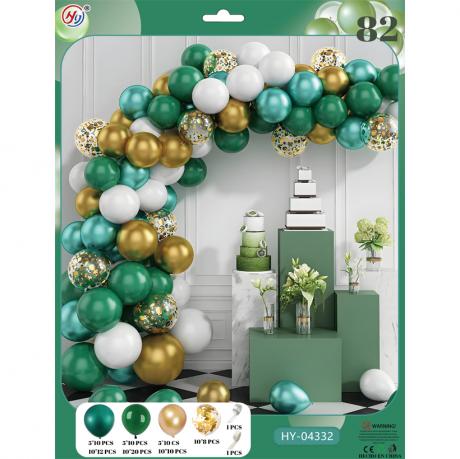 Набір повітряних куль складається з 82 одиниць різних кольорів. У ньому є смарагдові кулі розміром 5" (10 шт) та 10" (12 шт), зелені кулі 5" (10 шт) та 10" (20 шт), золоті кулі 5" (10 шт) та 10" (10 шт), а також кульки з наповненням "блискітки" 10" (8 шт). У комплект входять стрічка для кріплення куль і рулон клейових точок.