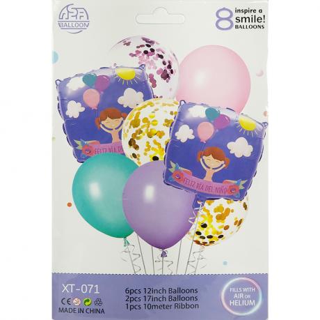 Набір кульок містить 8 елементів для створення яскравої святкової композиції. У комплект входять 6 латексних кульок розміром 12 дюймів, 2 фольговані кульки 17 дюймів та стрічка довжиною 10 метрів. Кульки можна наповнювати повітрям або гелієм; вони підходять для дня народження, фотозон, дитячих свят та тематичного декору. Упаковка компактна та зручна для зберігання.