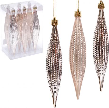 Набір ялинкових прикрас 6279-11C (6 шт.) — вишуканий комплект підвісних іграшок у витонченому кольорі шампань із поєднанням матових і глянцевих поверхонь. У наборі 6 пластикових прикрас довжиною 17 см і діаметром 3,5 см з оригінальним рельєфним візерунком, що підкреслює м’який блиск і благородство відтінку. Елегантна витягнута форма надає прикрасам легкості та чудово поєднується з іншими новорічними декораціями. Виготовлені з міцного, легкого пластику, безпечного для дітей і тварин. Упаковані у прозору пластикову коробку розміром 13×8×18 см. Ціна вказана за набір із 6 штук. Ідеально підходять для декору ялинки, святкових композицій чи інтер’єру.