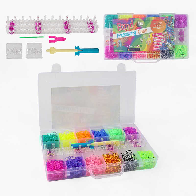 - Набір резиночок для плетіння C 74652 (60) 12 кольорів, пластикова фурнітура, гачок, рогатка, верстат, в боксі