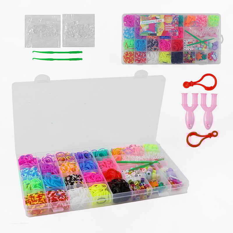 Набір резиночок для плетіння C 74659 (136) 23 кольори, пластикова фурнітура, гачок, рогатка, карабіни, намистинки, букви, підвіски, в боксі