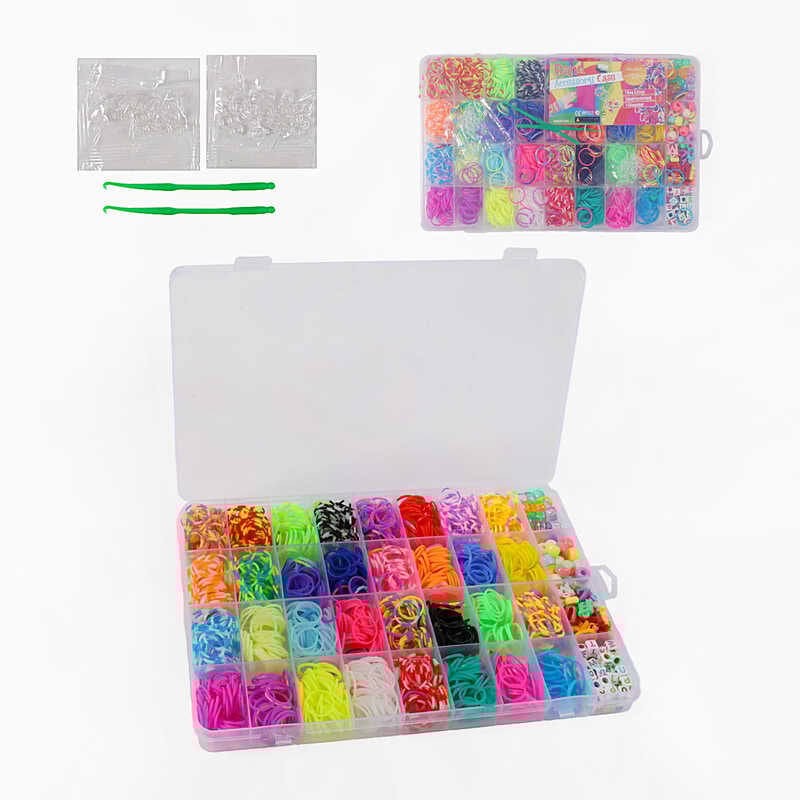 Набір резиночок для плетіння C 74661 (120) 32 кольори, пластикова фурнітура, гачок, намистинки, букви, підвіски, в боксі