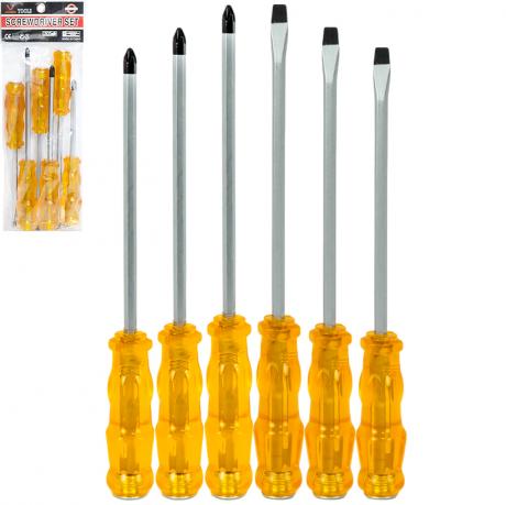 Набір викруток складається з 6 інструментів з хрестовими та шліцьовими (мінус) наконечниками і призначений для монтажних та ремонтних робіт. Викрутки оснащені ергономічними ручками, які забезпечують зручний і надійний хват та зменшують втому під час тривалого використання. Міцні стержні гарантують точну передачу зусилля та підходять для різних типів кріплення. Набір підходить для побутового й професійного застосування.