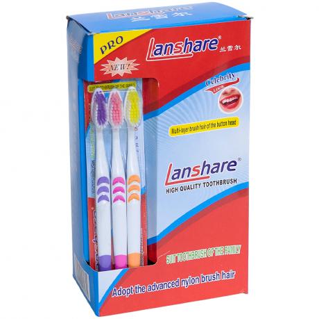 Набір зубних щіток «Lanshare» S693 призначений для щоденної гігієни ротової порожнини та зручний для використання вдома. У комплект входять 3 зубні щітки довжиною 19 см, розміщені на одному блістері. Щітки оснащені синтетичною щетиною, яка ефективно видаляє зубний наліт і залишки їжі, забезпечуючи якісне очищення поверхні зубів і міжзубних проміжків. Розмір головки 3×1 см дозволяє зручно очищати важкодоступні ділянки без подразнення ясен. Конструкція класична, без зони для очищення язика. Блістер розміром 5×24 см зручний для викладки. У транспортній упаковці 7×14×24,5 см міститься 12 наборів, що оптимально для оптового продажу.