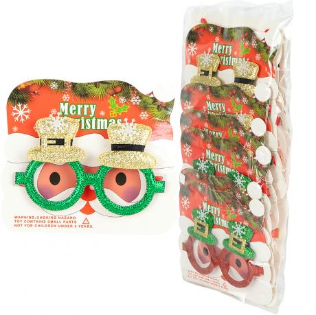 Новорічні окуляри без скелець — оригінальний аксесуар із блискітковим декором у святковому стилі. Виготовлені з легкого пластику з глітерним покриттям і прикрашені фігурними елементами. Розмір: ширина 14 см, висота 9,5 см, діаметр оправи 6 см, отвір 4,5 см. Окуляри міцні, добре тримаються та підходять для дітей і дорослих. Чудово доповнять новорічний костюм або святковий образ.